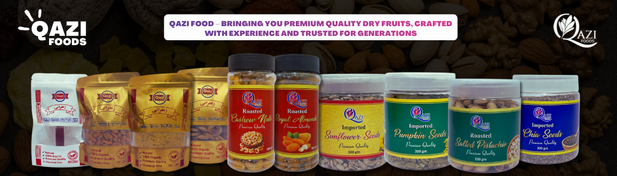 At Zafrani by Qazi Foods, we take pride in delivering premium quality dry fruits, seeds, oils, and spices sourced from the finest growers across Pakistan and beyond. Based in Lahore, we offer 100% pure, fresh, and organic products — from crunchy almonds (badaam), rich pistachios (pista), and flavorful walnuts (akhrot) to wholesome chia and pumpkin seeds, aromatic spices, and cold-pressed natural oils. Our mission is to promote a healthier lifestyle through natural, chemical-free foods while providing a seamless online shopping experience. With a strong commitment to quality, purity, and customer satisfaction, Zafrani by Qazi Foods has earned the trust of customers who value authentic taste and freshness — bringing nature’s finest ingredients straight to your doorstep anywhere in Pakistan.